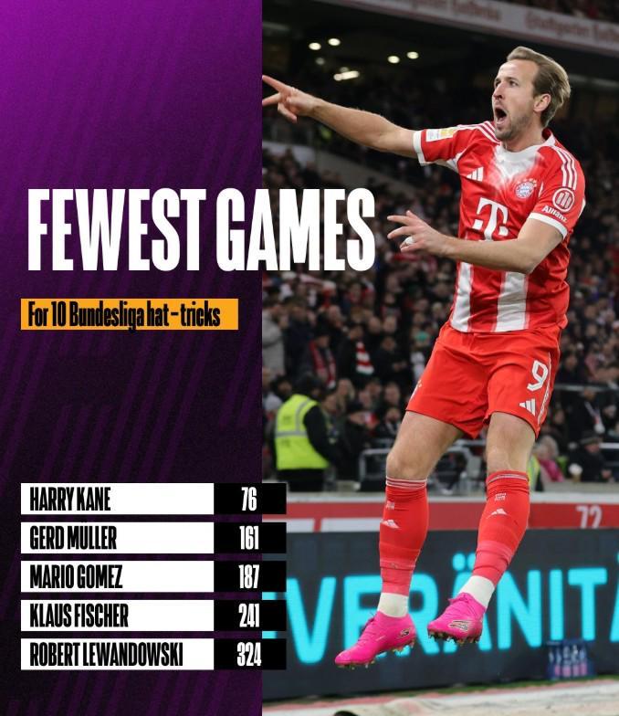 根據統計,凱恩在他的第76場(chǎng)德甲比賽中打入了在聯(lián)賽中的第10個(gè)帽子戲法,成為德甲完成10次帽子戲法所用場(chǎng)次最少的球員。